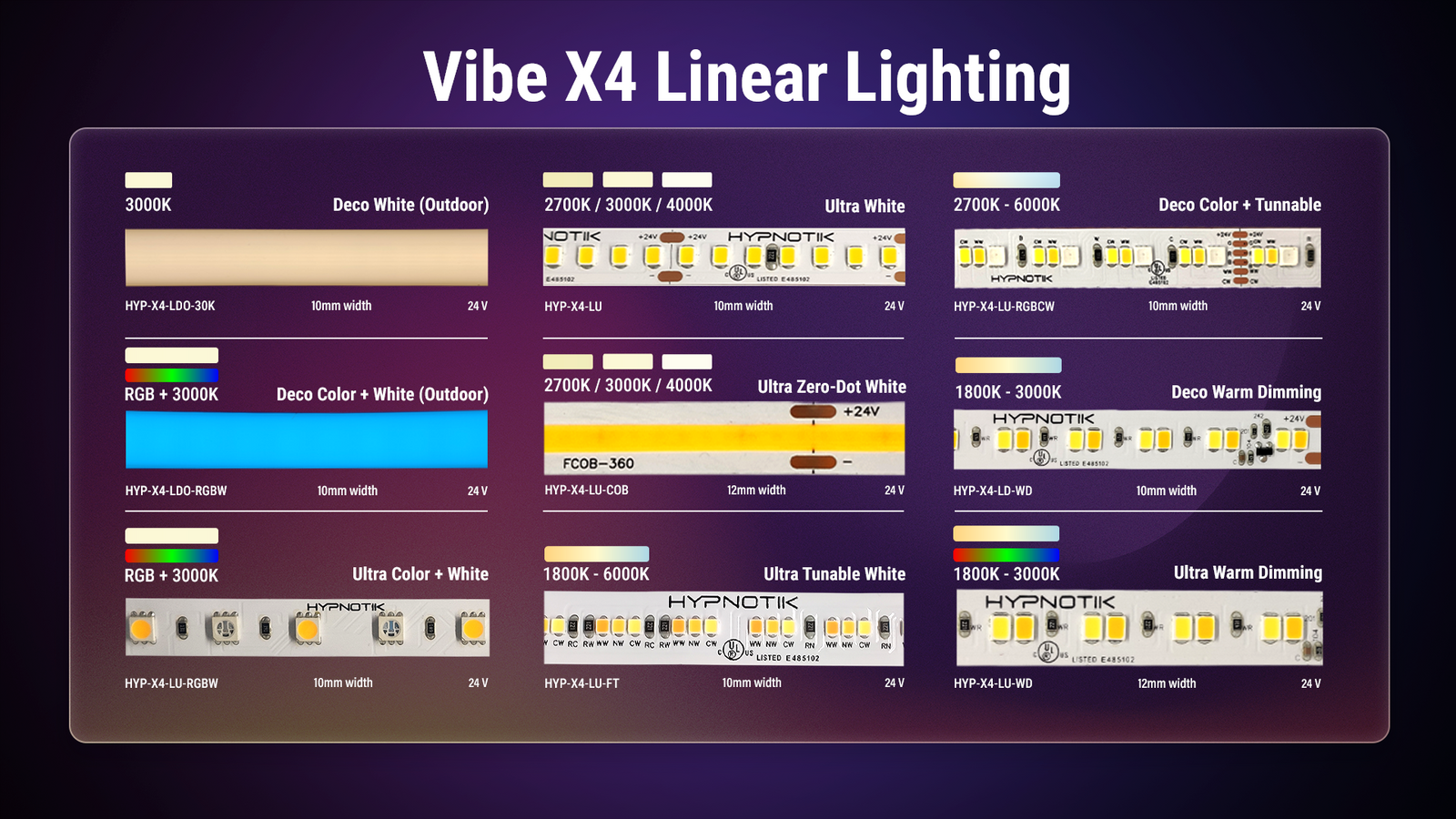 Experience the pinnacle of linear lighting performance with our Vibe X4 Ultra series, offering five distinct lighting technologies to meet any application need. All products feature Control4 SDDP compatibility for seamless smart home integration, exceptional color rendering, and professional-grade performance. Choose from fixed white, zero-dot COB, tunable white, or vibrant color options—all backed by a 5-year warranty and compatible with our complete ecosystem of controllers and apps.